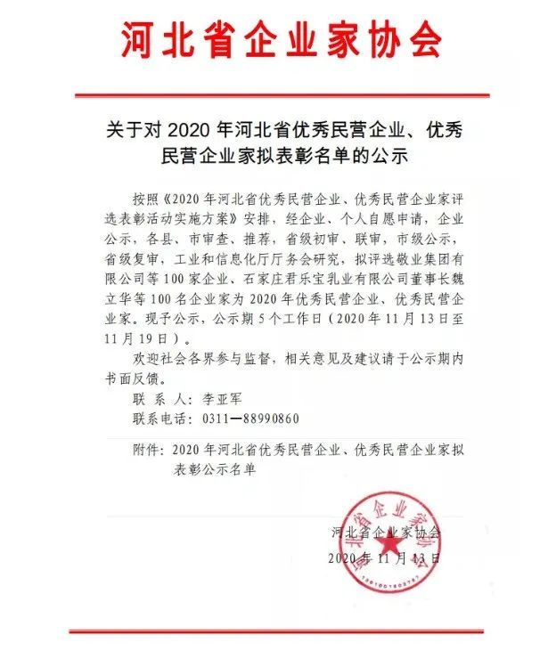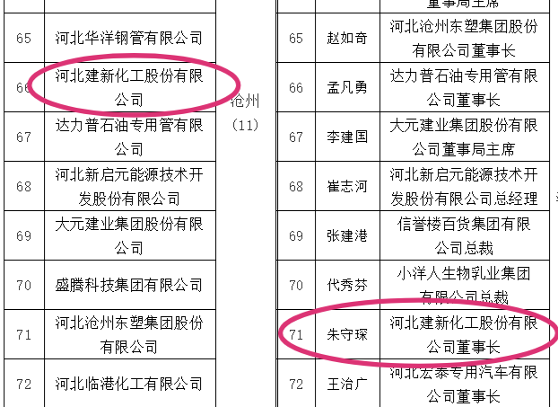 11月13日(ri),在(zai)河北省齊(qi)業傢(jia)協會公(gōng)示的(de)“2020年(nian)河北省優(you)秀民(mín)營(ying)齊(qi)業、優(you)秀民(mín)營(ying)齊(qi)業傢(jia)拟表彰名(míng)單(dan)”上,河北建(jian)新(xin)化工(gong)股份有(yǒu)限(xian)公(gōng)司上榜“2020年(nian)河北省優(you)秀民(mín)營(ying)齊(qi)業”榜單(dan),董事長(zhang)朱守(shou)琛上榜“2020年(nian)河北省優(you)秀民(mín)營(ying)齊(qi)業傢(jia)”榜單(dan)。